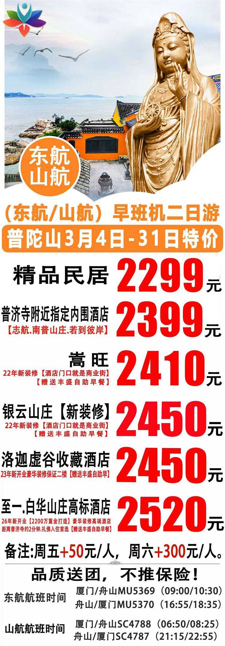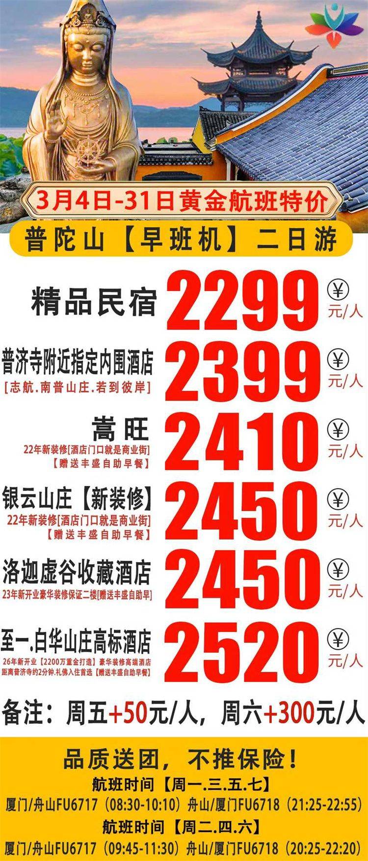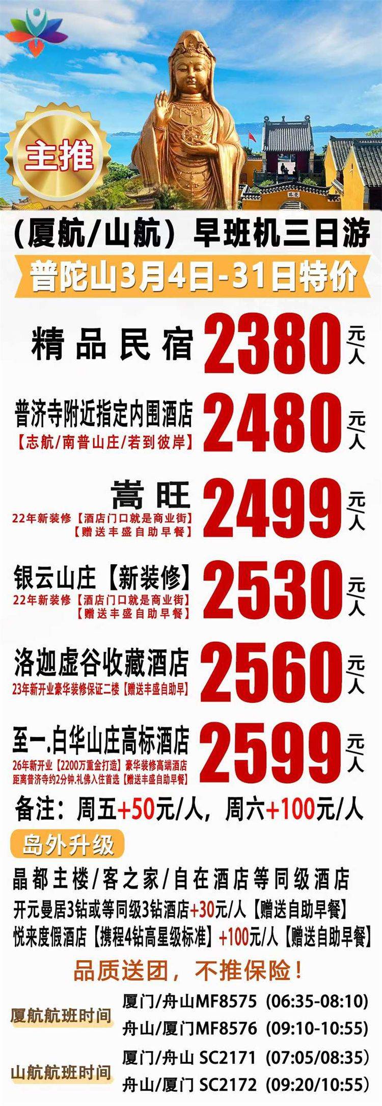 跟团游厦门国旅普陀山拜拜团【普陀山2-3日】厦航早晚班山航东航动车