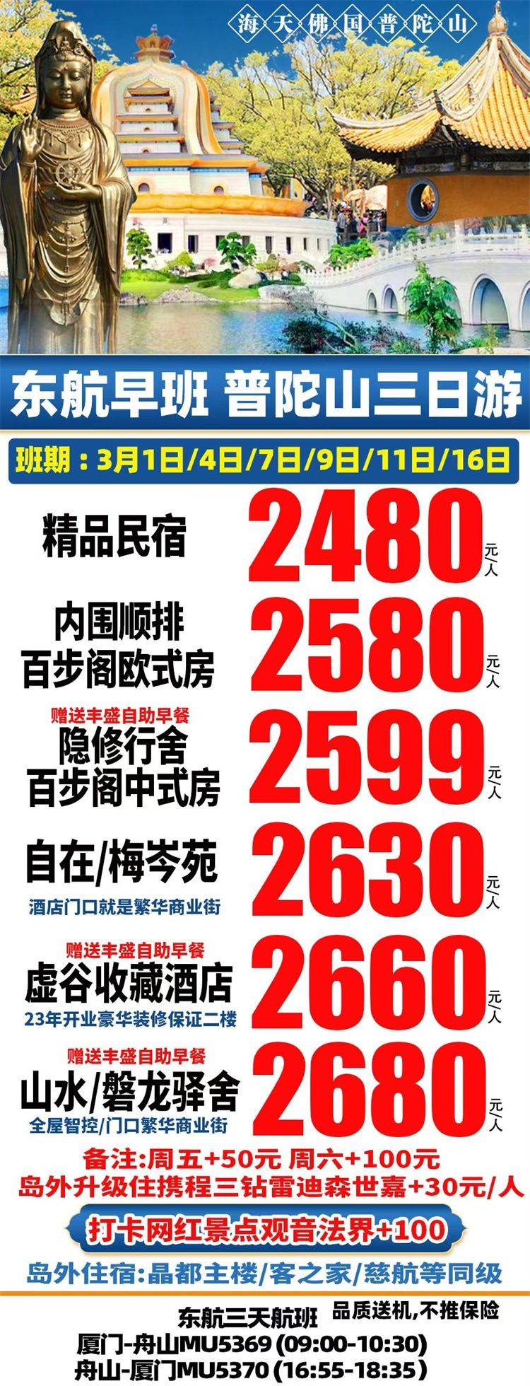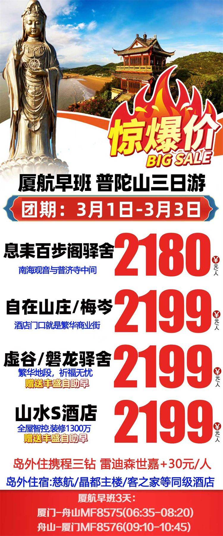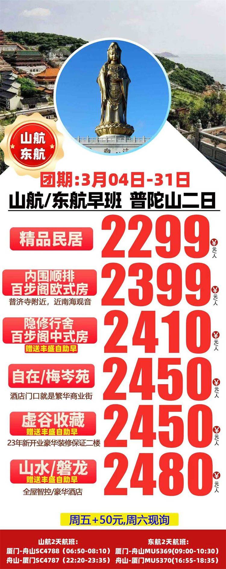 跟团游厦门国旅普陀山拜拜团【普陀山2-3日】厦航早晚班山航东航动车