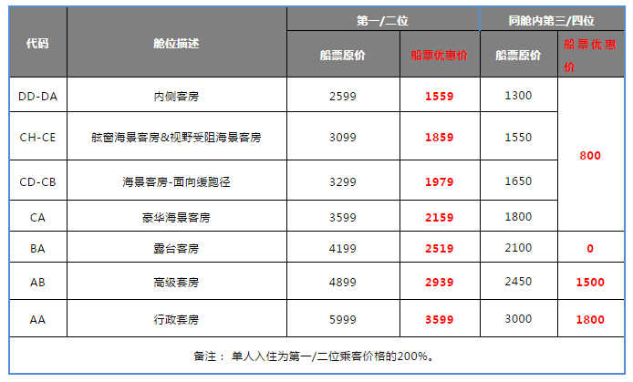 常规航次特惠活动(以下活动均可同时享受): 1、提前30天预订以上航次可享船票优惠价; 2、2岁以下婴儿为同舱第三四人免船票(所有房型); 3、报名露台客房可享同舱第三人免船票。