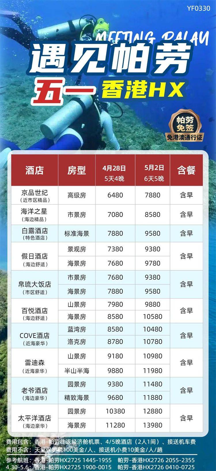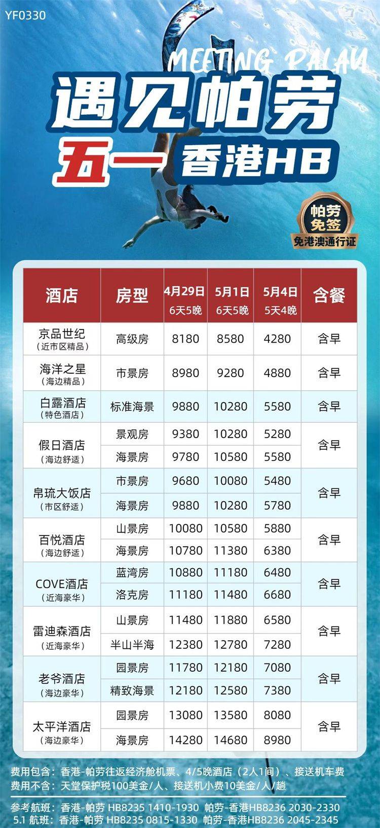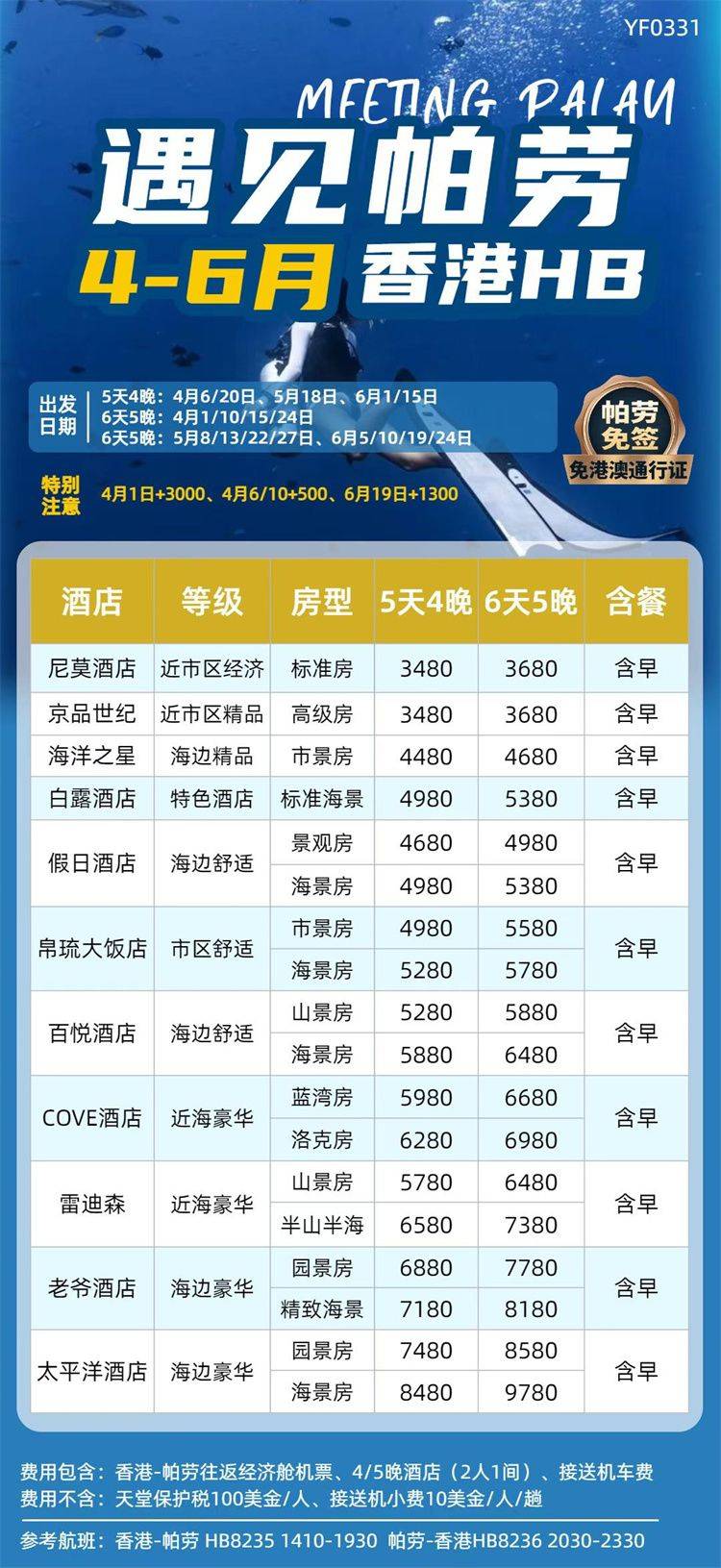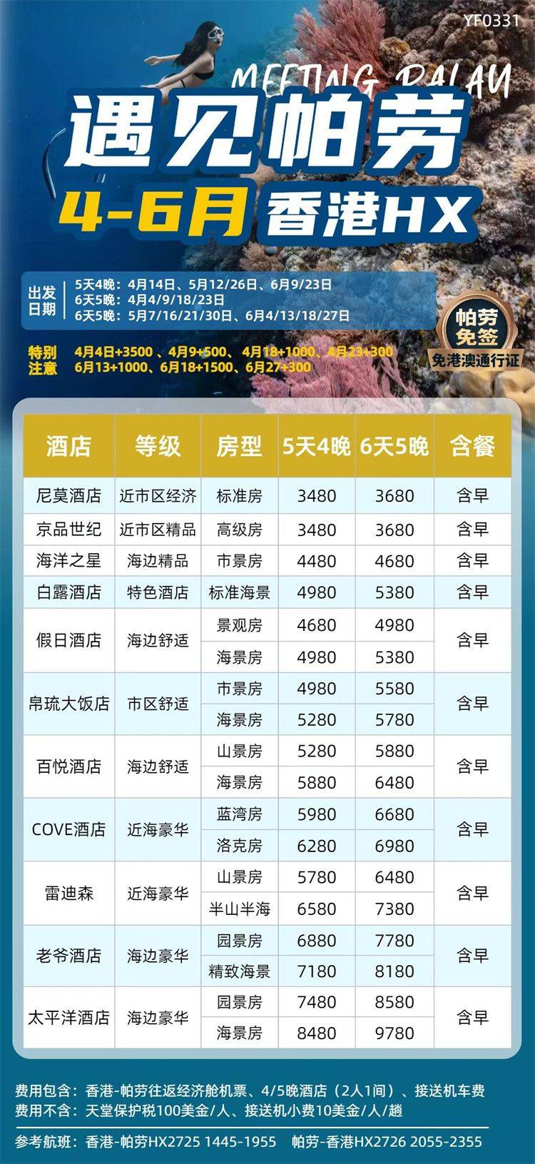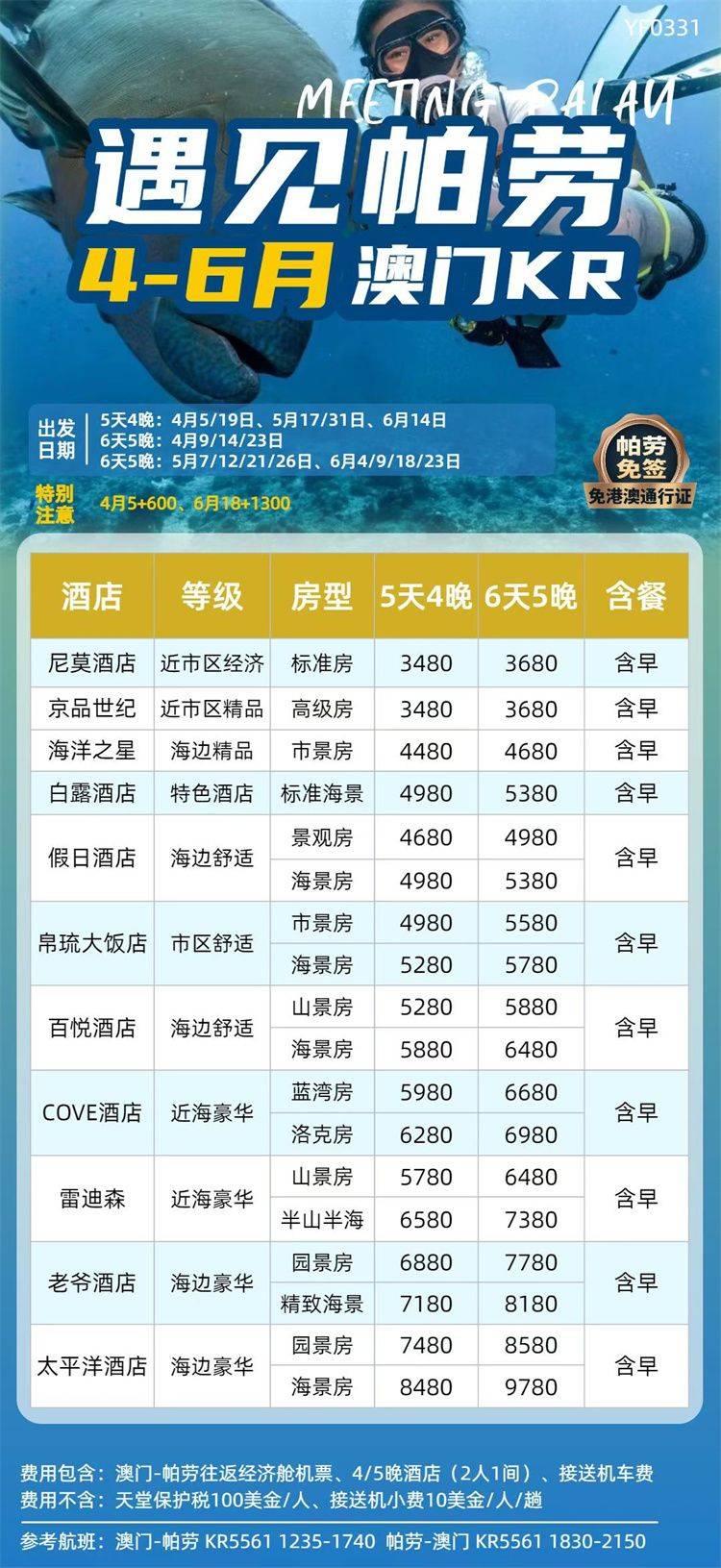跟团游4-6月澳门香港直飞【帕劳机票酒店5-6天】旅游线路合集