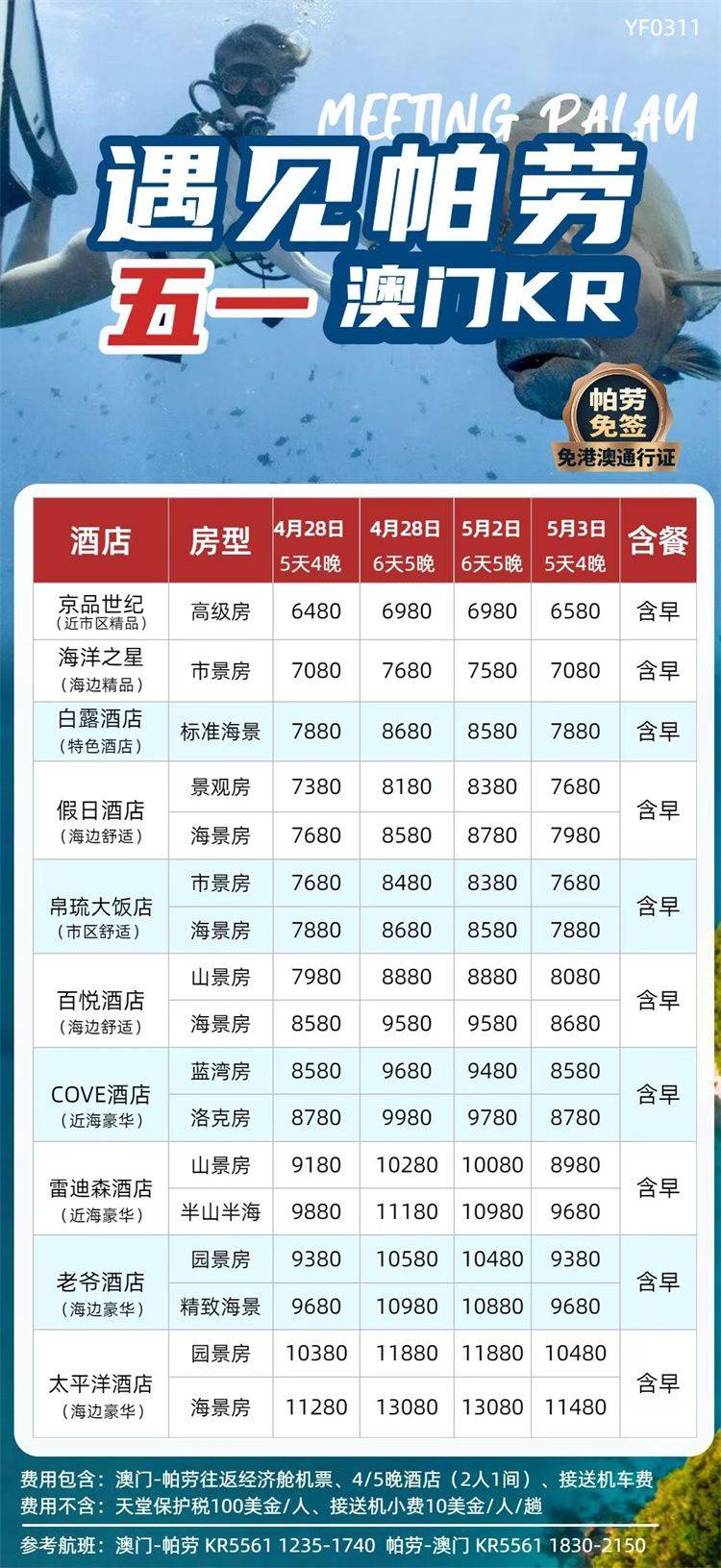 费用包含:澳门-帕劳往返经济舱机票、4/5晚酒店(2人1间)、接送机车费
